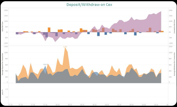 上面图中,第一张代表着每日交易所的充值/提现情况,其中黄色代表当日净充值,蓝色代表当日净提现。阴影面积是充值提现的累计。第二张图代表着每笔充值/提现的平均数量,用来判断充值和提现是否是大户行为还是散户行为。直观的看,值比较高的就是大户的行为,而峰值比较低的主要是都是散户的行为。