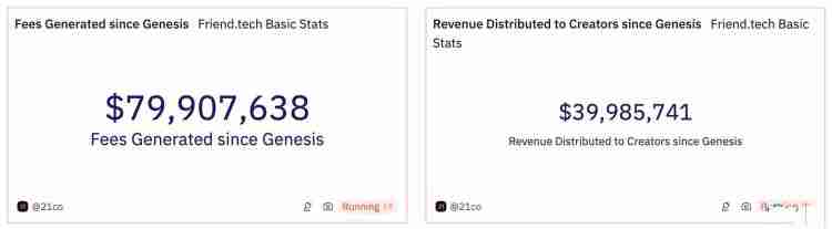 据21co的Dune面板数据,Friend.tech自上线以来共产生约7,990万美元的手续费收入,其中3,998万美元分配给创作者,剩余部分归Friend.tech团队所有,这意味着该团队获利约3,992万美元。