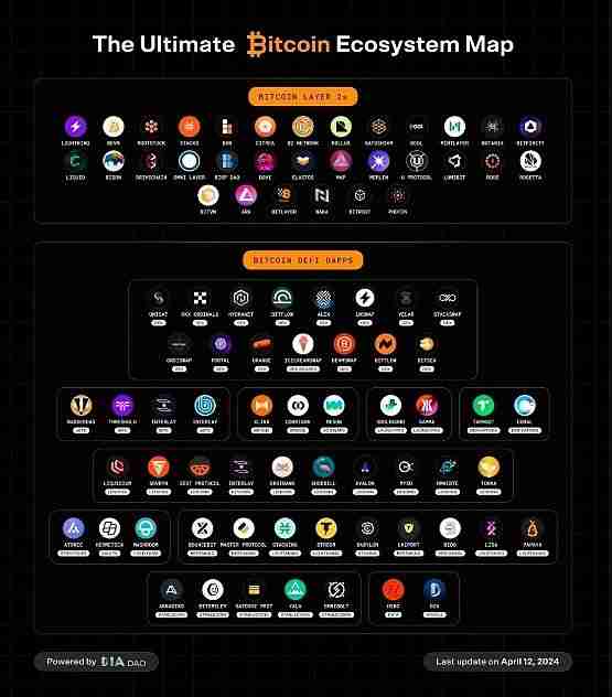 截至 2024 年 4 月 12 日的比特币第 2 层和 DeFi 生态系统。来源:DIA DAO