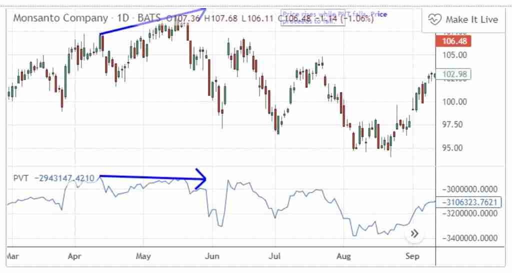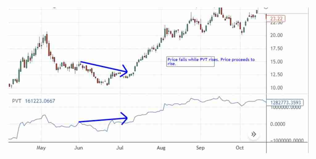 本质上说,PVT应与资产价格的方向一致,幅度应该也同步。也就是说,PVT的价值应随着资产价格的上涨而增加,反之亦然。如果价格上涨而交易量下降,此时便预示着价格或将逆转。