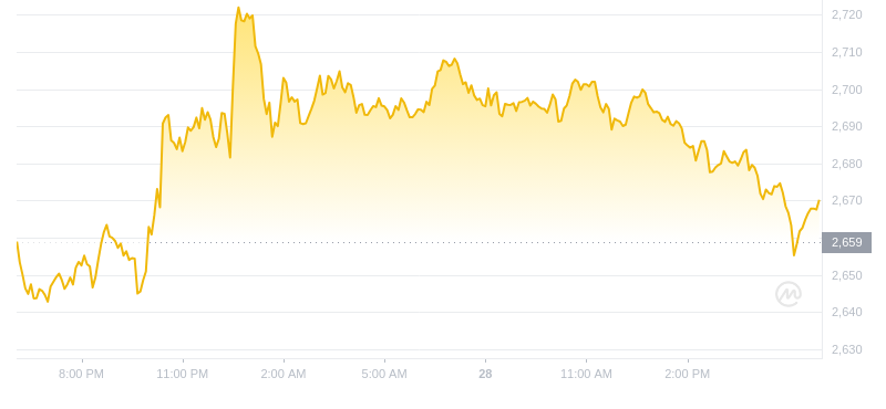截至 2024 年 9 月 28 日 18 时,Ethereum (ETH) 的价格为 2702.18 美元,24 小时的交易量为 1659.68 亿美元。在过去 24 小时内,ETH 的价格上涨了 3%。