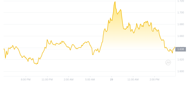 截止 2024 年 9 月 29 日,Sui (SUI) 报 1.64 美元,24 小时交易量为 3.9 亿美元。