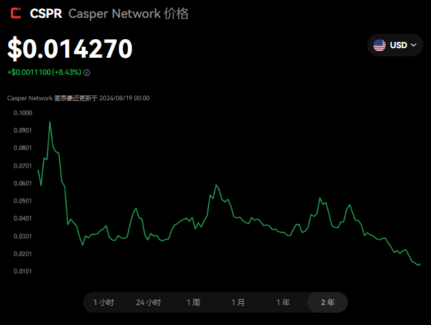 CSPR币于2021年3月正式上线交易,最高触及1.3美元的历史高点。此后,价格大幅回落,最低跌至0.15美元附近。目前,CSPR币价格在0.3美元至0.5美元区间震荡。