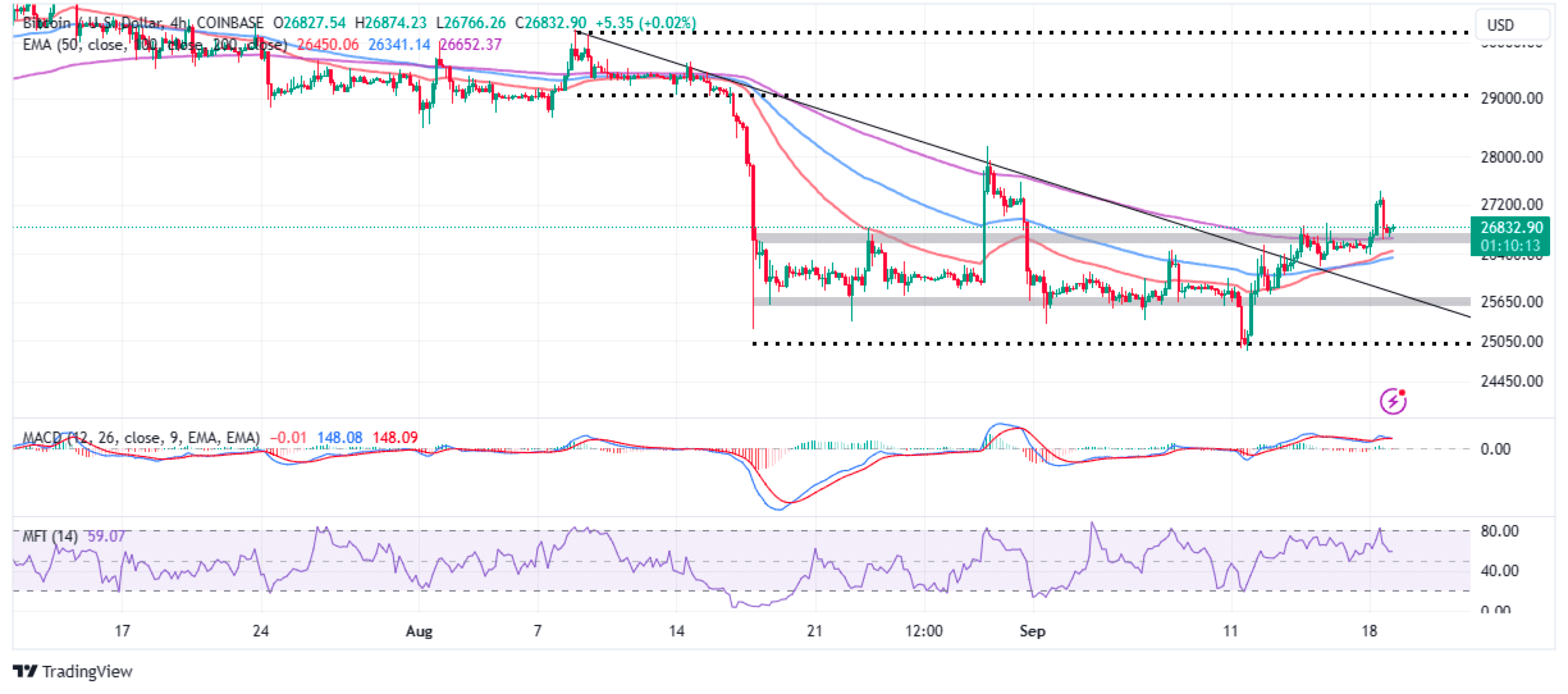 BTC 价格遵循之前价格分析中讨论的看跌分形 。由于卖方在 27,200 美元的拥堵, 比特币价格 跌破 27,000 美元的支撑/阻力位,目前交易价格为 26,830 美元。