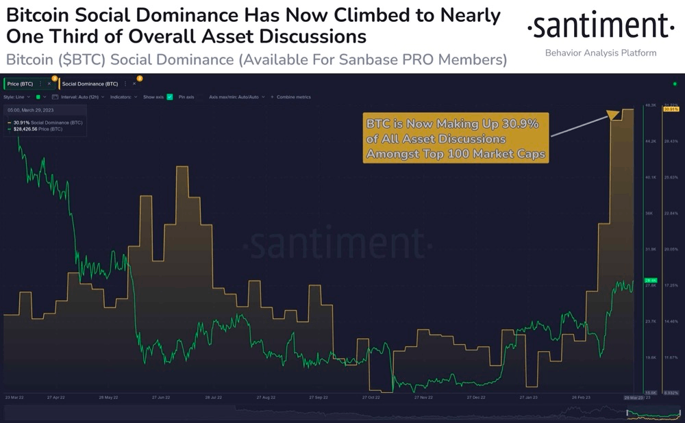 从好的方面来看,如果比特币价格成功突破 28,600 美元,它可能会在 29,000 美元至 32,000 美元的范围内进一步反弹。同样,不利的一面是,如果 BTC 价格跌破 27,000 美元的支撑,它可能会进一步跌至 26,000 美元及以下。链上数据还显示,在当前价格上涨的情况下,BTC 的社会主导地位已达到一年新高。