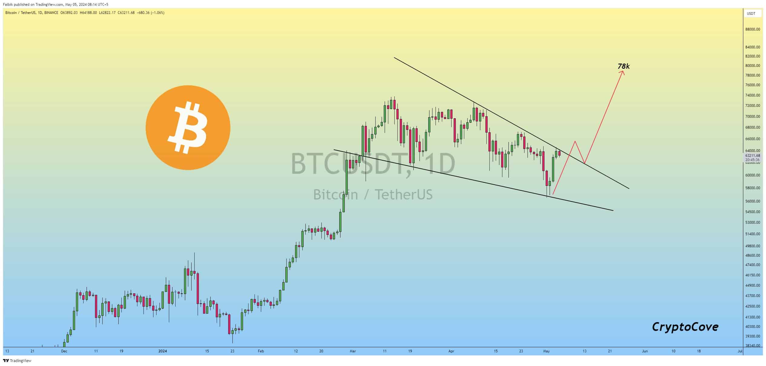 Poppe 阐述了比特币价格的预期下跌,“预计将修正至 60-61,000 美元,然后在该区间内稳定延续。”与此同时,Captain Faibik 等其他加密货币分析师预计比特币将出现抛物线式飙升。 Faibik 在 X 最近的一篇文章中指出,当比特币交易价格低于 60,000 美元时,反弹至 61,000 美元以上可能会导致看涨。