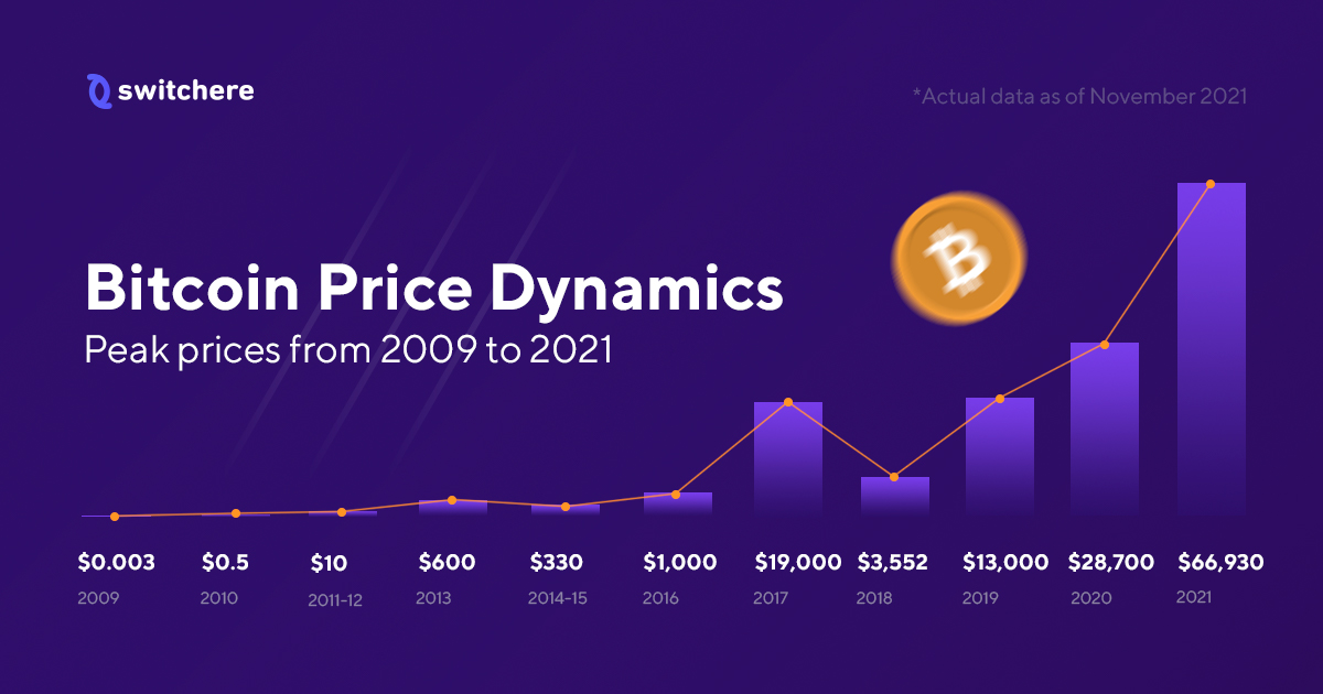 这是比特币 2009 年至 2021 年的峰值价格图表。不过,请继续阅读以获取更多详细信息!