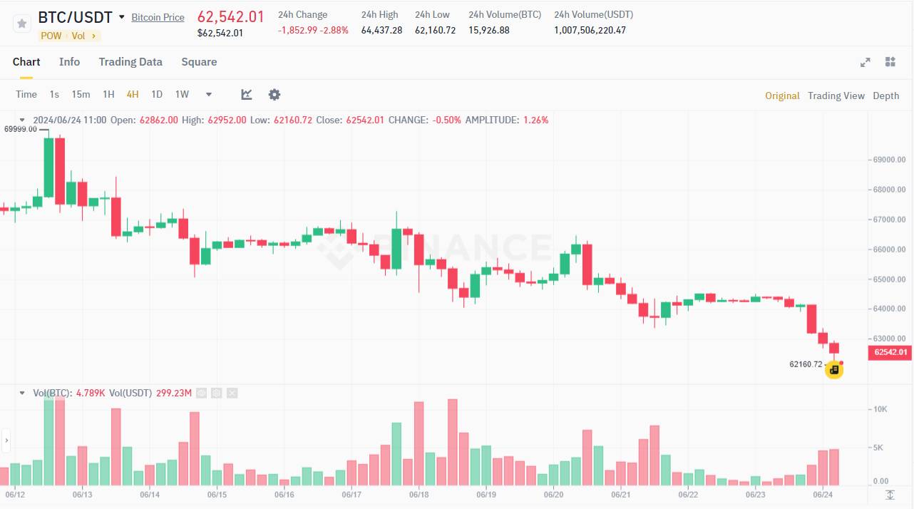 币安 2024 年 6 月 24 日下午 02:30 BTC/USDT 货币对 4 小时图