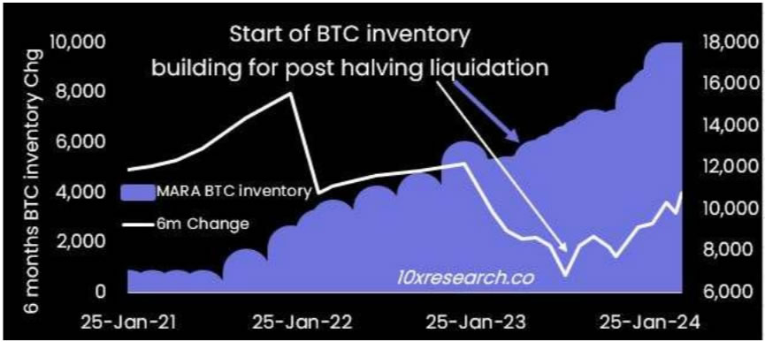 蒂伦表示,全球最大的比特币挖矿公司马拉松已经建立了库存储备,“这些库存可能会在减半后逐渐出售,以防止收入下降”。