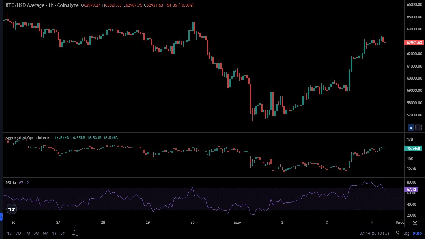 尽管看跌情绪盛行,但比特币多头正在积极努力,通过将价格推高至 60,000 美元的心理重要水平上方来恢复势头。值得注意的是,资深交易员彼得·勃兰特(Peter Brandt)强调,如果比特币维持近期低点并继续其上行轨迹,则典型牛市延续模式的可能性。与此同时,我们可以看到比特币的未平仓合约飙升超过 6.45%,估值达到 165 亿美元。表明熊市预测的 RSI 为 67.12,因此与近期比特币价格上涨 6.29%(交易价格为 63,289 美元)相关。