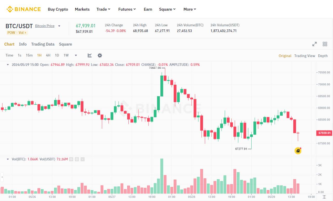 币安 2024 年 5 月 29 日下午 03:30 BTC/USDT 货币对 1 小时图