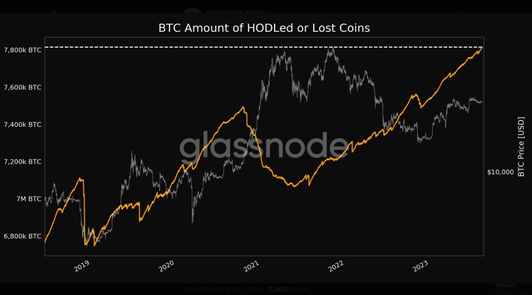 其影响是重大的,表明随着时间的推移,相当数量的比特币可能已经不可逆转地丢失了。Glassnode 的推文呼应了这种情绪,表明 7,781,224.168 BTC 可能已被持有或永久丢失。