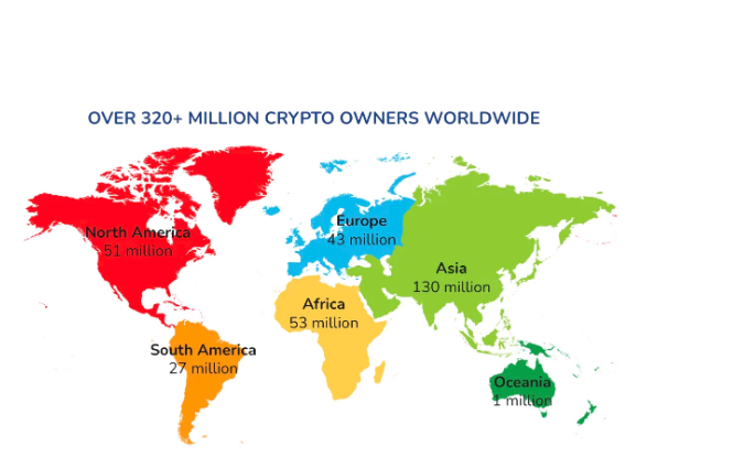加密货币在不同地区特别是各大洲的分布情况也各有差异。亚洲拥有1.2亿加密货币所有者,是投资加密货币人数最多的大陆。非洲排名第二,因为它有超过5300万加密货币用户。北美有5100万,欧洲有4300万,南美洲有2700万,大洋洲有大约100万加密货币用户。