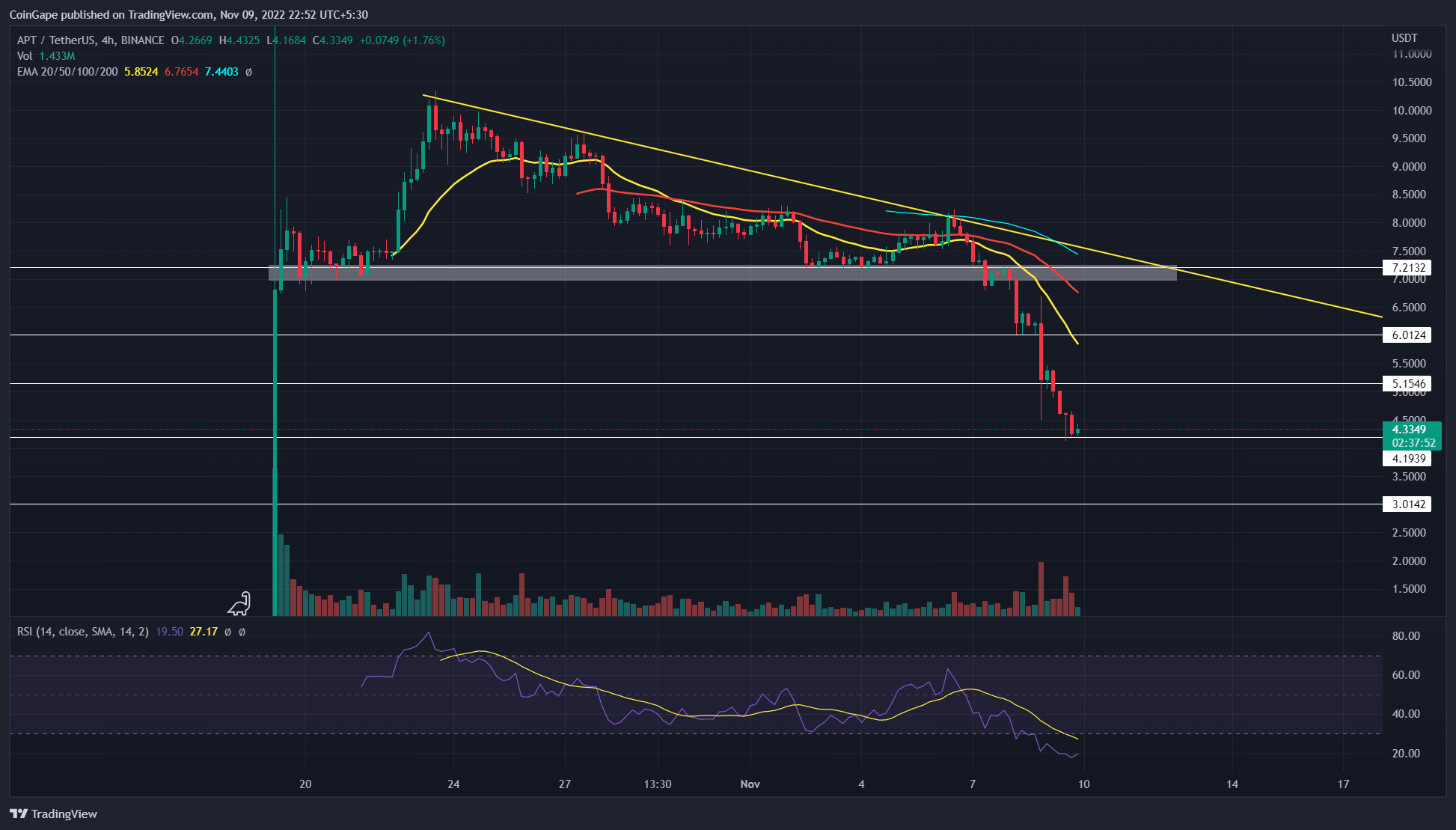 Aptos 代币价格将继续下跌,直到下降趋势线完好无损。
