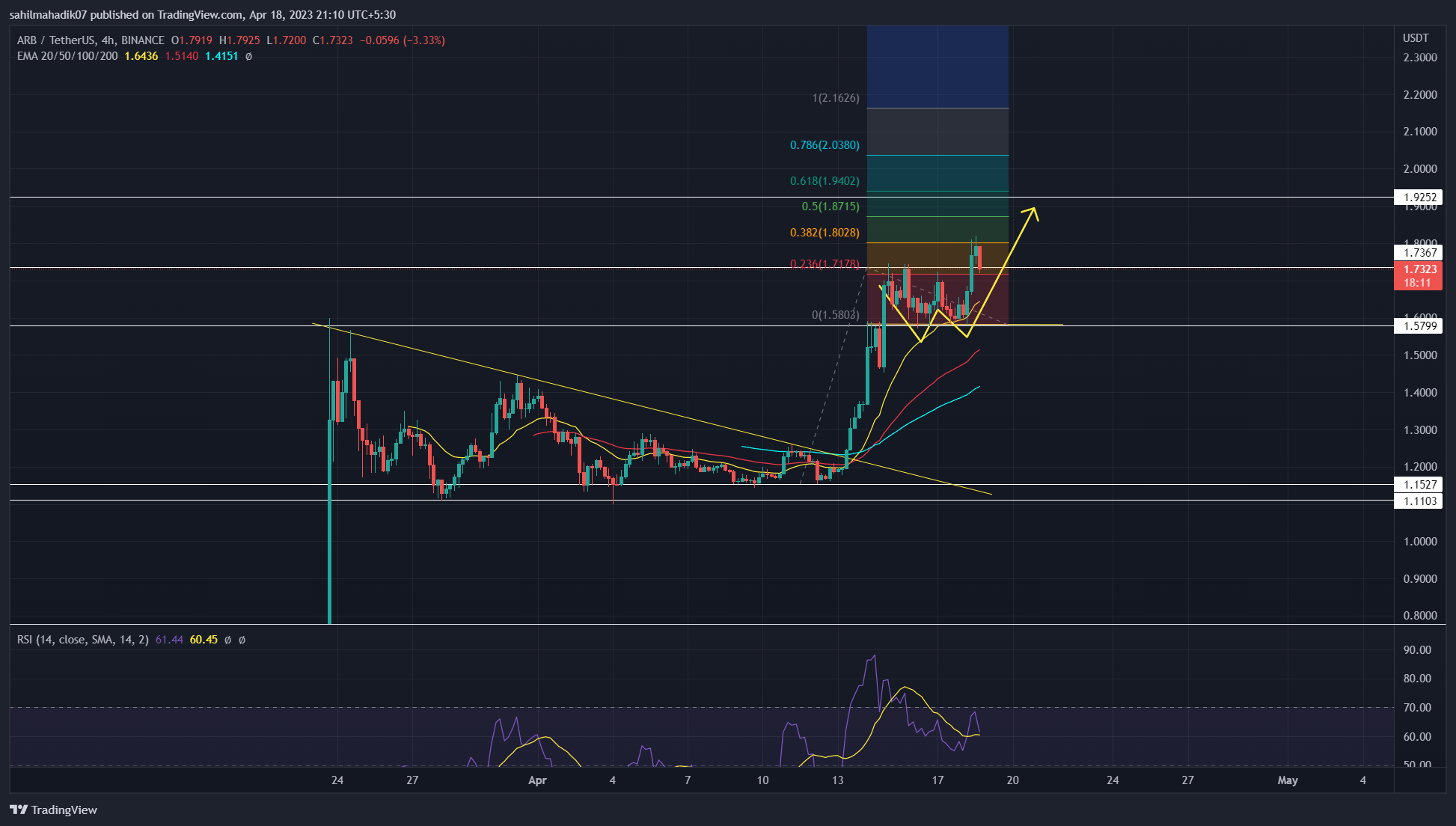 今天,ARB 价格上涨 8.92%,并从双底形态的 1.73 美元颈线阻力位大幅突破。这一突破应该表明恢复看涨势头和恢复上升趋势的可能性更高。