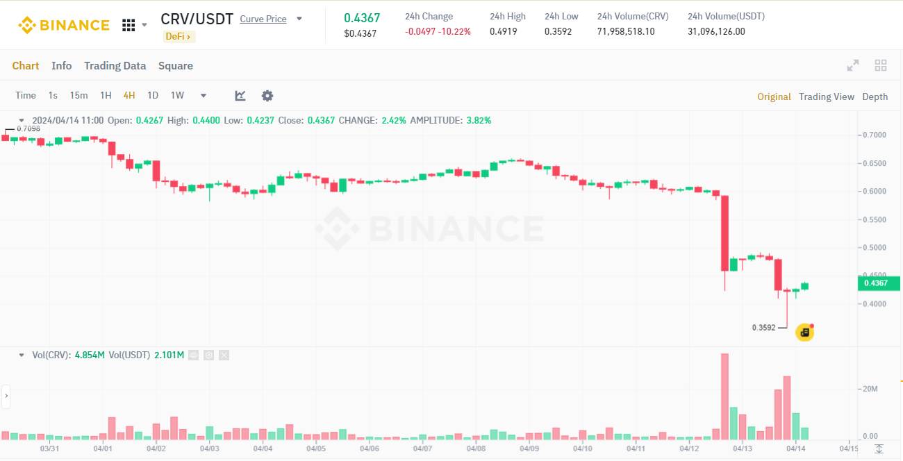 币安 2024 年 4 月 14 日中午 12:20 CRV/USDT 货币对 4 小时图