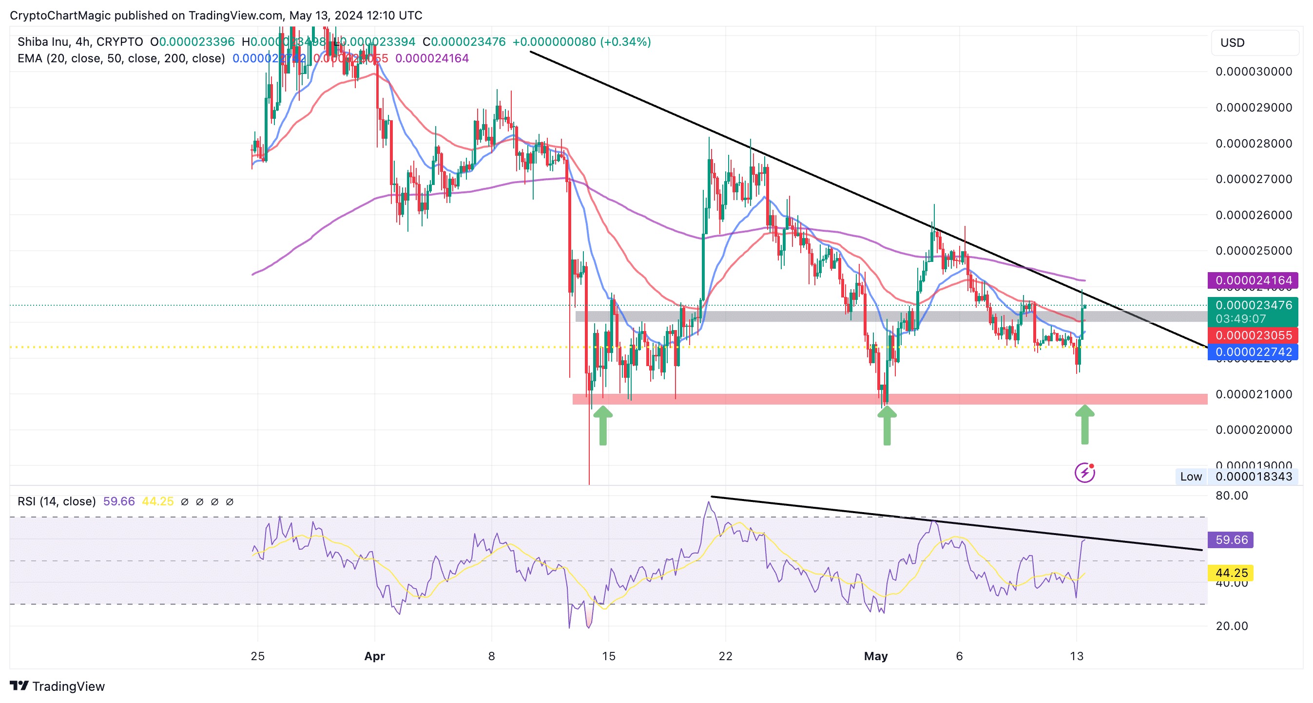 图表上的灰色带代表柴犬的初始支撑位。如果受到尊重,多头将很容易在本周末将预期突破至少至 0.000028 美元,并在 6 月之前突破 0.00003 美元。