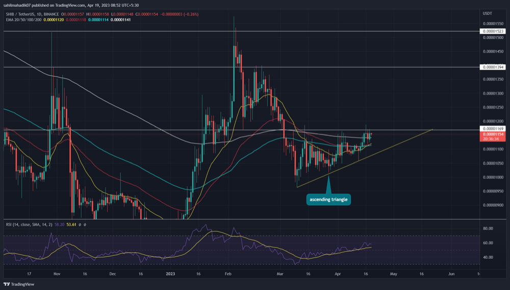 SHIB币4月19日价格预测:过去六周,SHIB 价格维持横向趋势,在上升支撑趋势线和 0.000017 美元水平颈线内产生共振。在日线图中,这两个水平揭示了上升三角形形态的形成。您可以通过以下方式交易此模式以抓住有利可图的多头入场机会。
