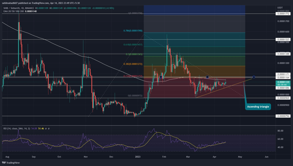 4月18日SHIB 价格预测: Shiba Inu 价格的持续盘整表明在每日时间框架图表中形成了上升三角形模式。这种模式是著名的看涨延续模式之一,在突破其颈线阻力后提供显着的上涨。在该模式中,更高低点的形成表明看涨势头逐渐增强,这将鼓励买家采取趋势控制。