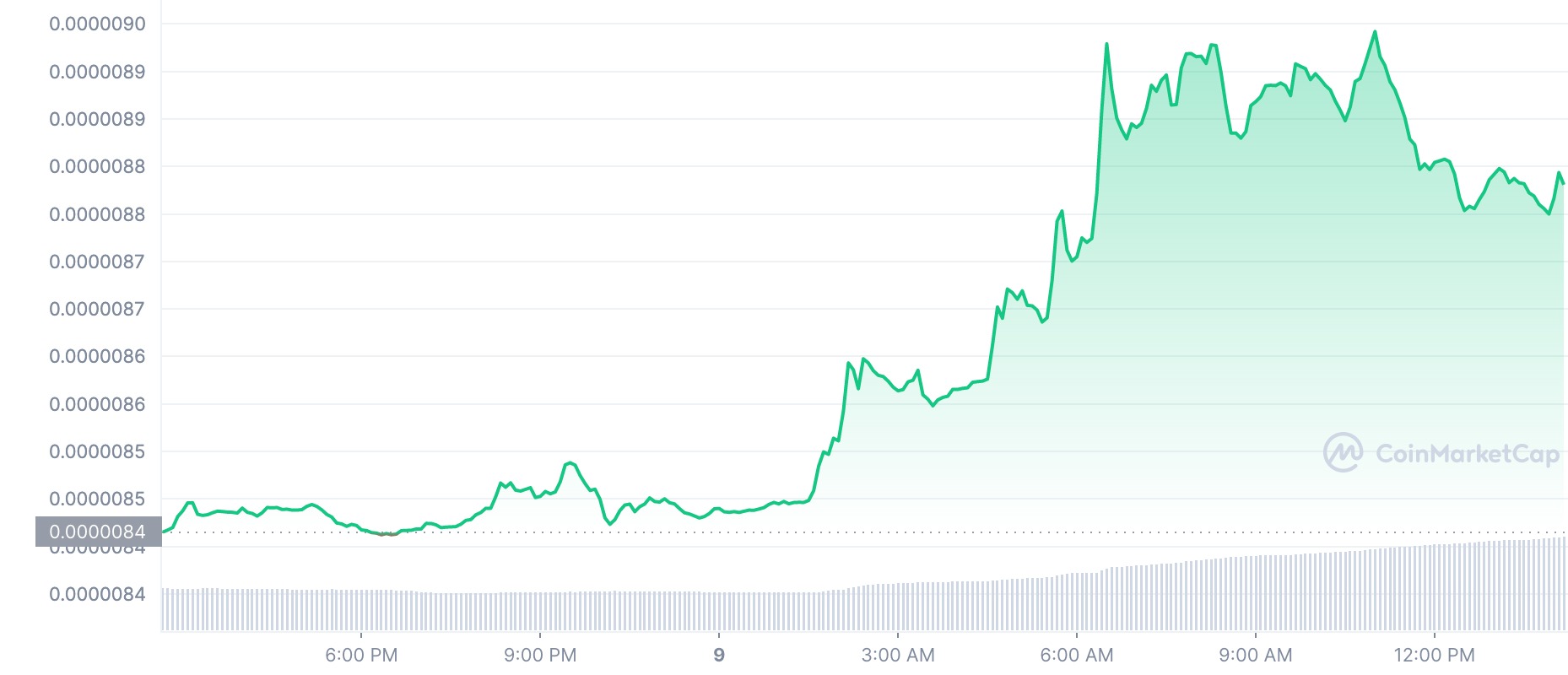 柴犬在烧伤后的最后 24 小时内增加了 4.44%。每个 SHIB 代币的价格为 0.000008793 美元。