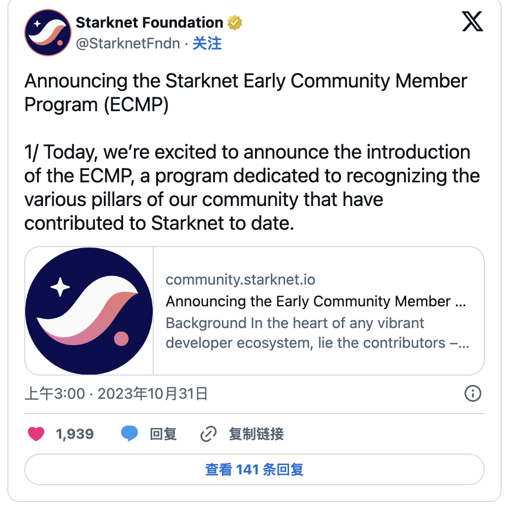 Starknet 基金会正在帮助开发以太坊第 2 层汇总 Starknet,并公布了早期社区成员计划 (ECMP)。该计划旨在奖励和激励早期生态系统贡献者的进一步支持。