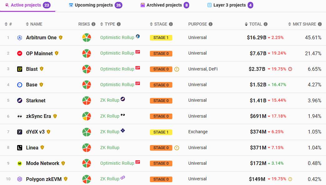 按 L2Beat 上锁定的总价值 (TVL) 对第 2 层网络进行排名。照片拍摄于 2024 年 3 月 20 日