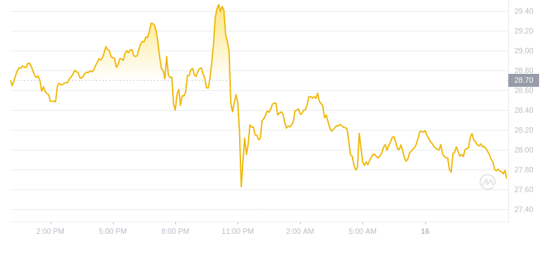 截至 2024 年 10 月 16 日中午,AVAX 的价格为 27.71 美元。24 小时交易量达到 5.17 亿美元,在过去一天内下跌了 3.56%。
