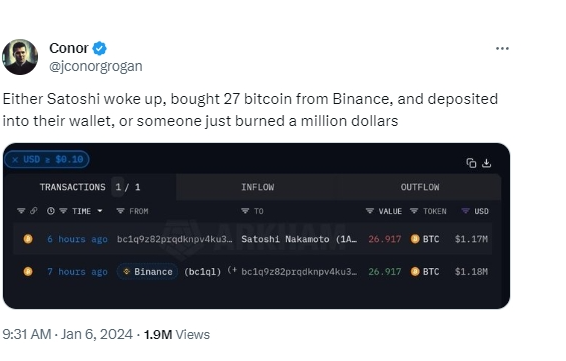 据Blockchain.com数据显示,尽管多年来有诸多地址向中本聪钱包发送小额比特币,但神秘地址发送近27枚比特币的交易是数量最多一次。此前,最多的交易是在2013年转入的4枚比特币。Coinbase主管Conor对此也做出了分析:“这不是中本聪苏醒了,就是有人将价值100多万美元的比特币转进中本聪钱包销毁。又或许,这是某种奇怪的ETF行销计划?”