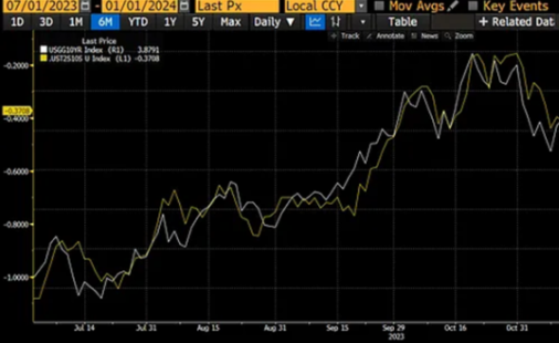 这份报告中,确认了美国财政部将借款更多地转移到收益率曲线的短端。随着国库券供应量的增加和收益率的提高,货币市场基金(MMF)将受到经济激励,使用 RRP 中存放的现金购买国库券。在其他条件相同的情况下,RRP 余额的下降增加了系统的流动性;这就是全球债券和股票市场大幅上涨的原因。白线是10年期国债,黄线是10年期和2年期国债收益率之间的差异。如你所见,收益率在10月底达到顶峰,呈熊式加剧趋势,意味着白线和黄线同时上升。11月初开始了一场猛烈的债券空头挤压,收益率暴跌。