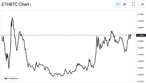 ETH/BTC 比率,即 ETH 对 BTC 的价格,很大程度上与 ETH.D 图表相似。 两大加密货币占市场的 60%——ETH 与 BTC 的关系在很大程度上决定了它在整个加密市场中的主导地位。
