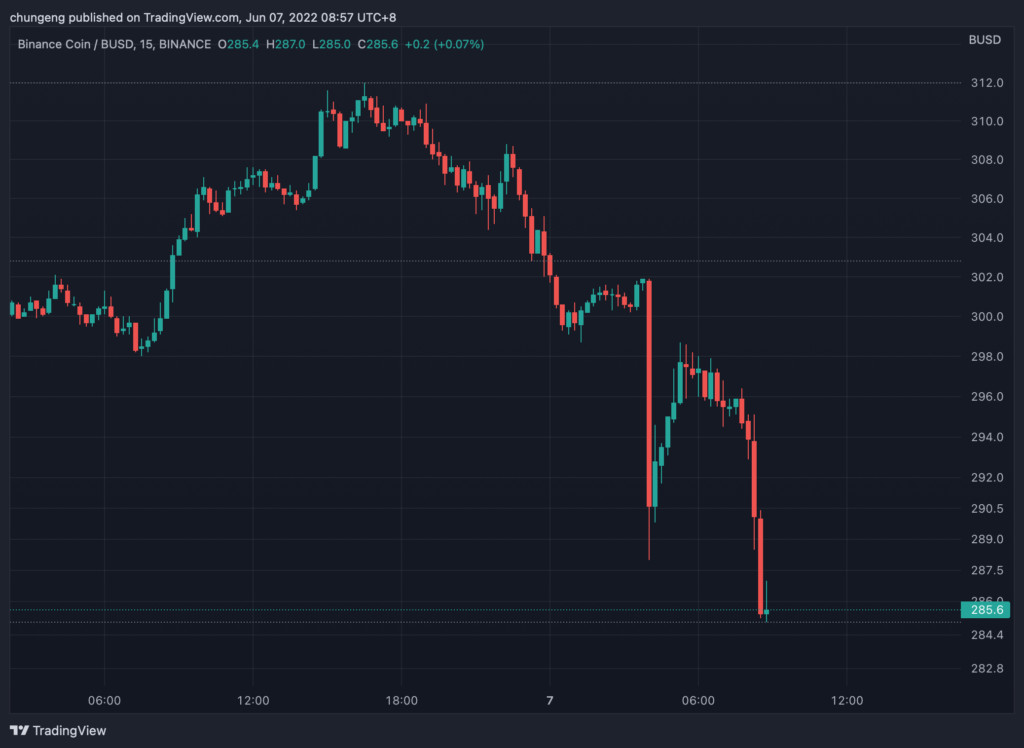 BNB价格的报告在凌晨4点发布后,引起了一些投资者的恐慌。代币价格在一小时内迅速下跌5%,随后虽然短暂上涨,但在截止日期前继续下跌,截止日期前暂时报285.6美元。