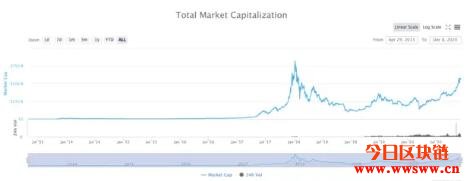 整个加密货币行业的总市值也是一个重要指标。在某种意义上,它可以作为区块链和加密货币产业累积价值的估计。