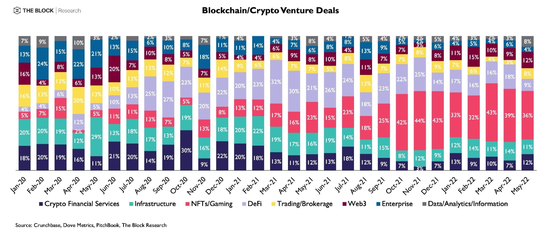 5月,DeFi投资仅占区块链/加密货币领域总风险投资的9%,NFT/博彩最高,占总投资的36%。(博联财经)