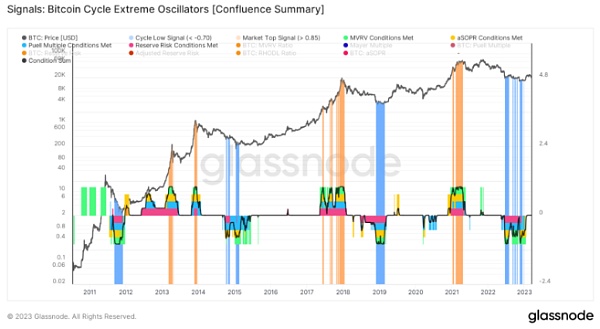 Glassnode 的 Cycle Extremes 指标考虑了四个最流行的指标,这些指标历来在确定 BTC 周期的峰值或低点时显示出很高的准确性。具体来说,它测量与以下振荡器的极端值的 /- 1 个标准偏差: