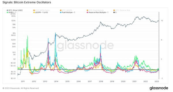 图表显示,持续熊市的极端出现在2022年6月中旬至12月底之间。随着比特币市场的反弹和2023年初以来的25,000美元的高位上涨,极端向下的蓝色信号偏差消失了。
