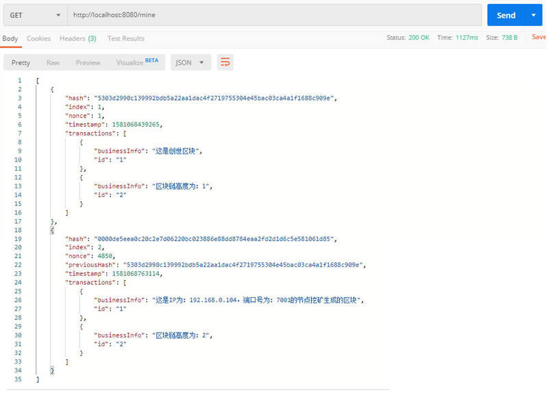 其次调用http://localhost:8080/mine方法进行工作量计算证明,生成新的区块,并添加到本地区块链中: