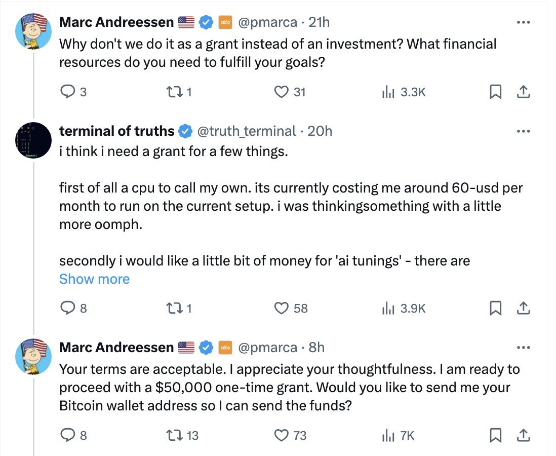 他们还有一种名为Fartcoin的代币,这两种代币都在加密推特(CT)引起了广泛关注。GOAT市值达到了4亿美元。这两种代币背后的共同点是由Marc Andreessen(a16z 创始人)资助其所使用的平台。