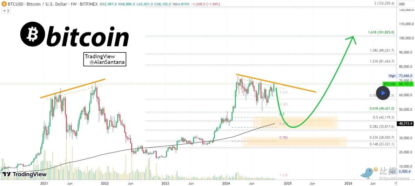 TradingView 分析师 Alan Santana 表示,随着减半后的牛市开始升温,此周期中比特币价格可能反弹至 30 万美元,到 2025 年初可能会飙升至 13 万美元。