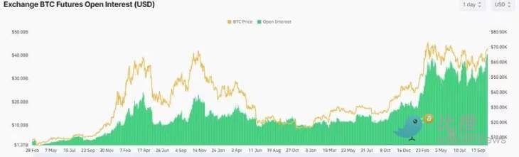 Coinglass 数据显示,跟踪主流交易所的美元计价比特币期货名义未平仓合约在周末突破 406.3 亿美元,创下历史新高。以代币计算,未平仓合约为 592,000 BTC,为 2022 年 12 月以来的最高水平。