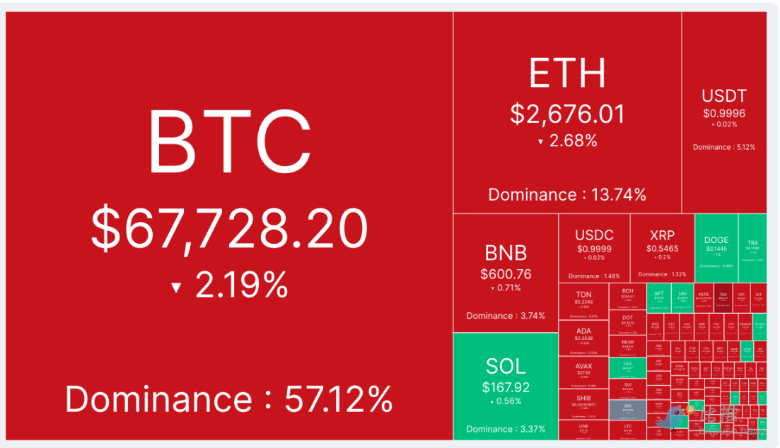 比推数据显示,在周一凌晨比特币触及 69,500 美元的高位后,空头将价格压至日低 66,796 美元,随后逢低买家介入,将其推回 67,500 美元以上,截至发稿时,BTC 交易价格为 67,728 美元,24 小时跌幅 2.19%。