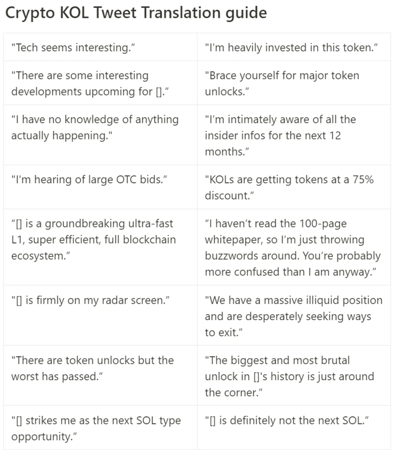 OTC “融资”:OTC “融资”很常见,本质上也不一定是坏事,但由于条款通常不会公布,这些交易往往会造成较大的不透明性。这其中最臭名昭著的当属所谓的“KOL 轮”,它会被视作代币价格的短期催化剂,某些头部 Layer 1 (我不想透露名字)最近也采用了这种策略 —— KOL 能够以较大的折扣(约 50%)和较短的锁定周期(六个月线性解锁)认购代币,出于利益考虑他们会努力将 xxx 营销为下一个 xxx(这里可自行带入某 Layer 1)杀手。如果你有疑问的话,可以看看我之前发布的 KOL 话术翻译指南。