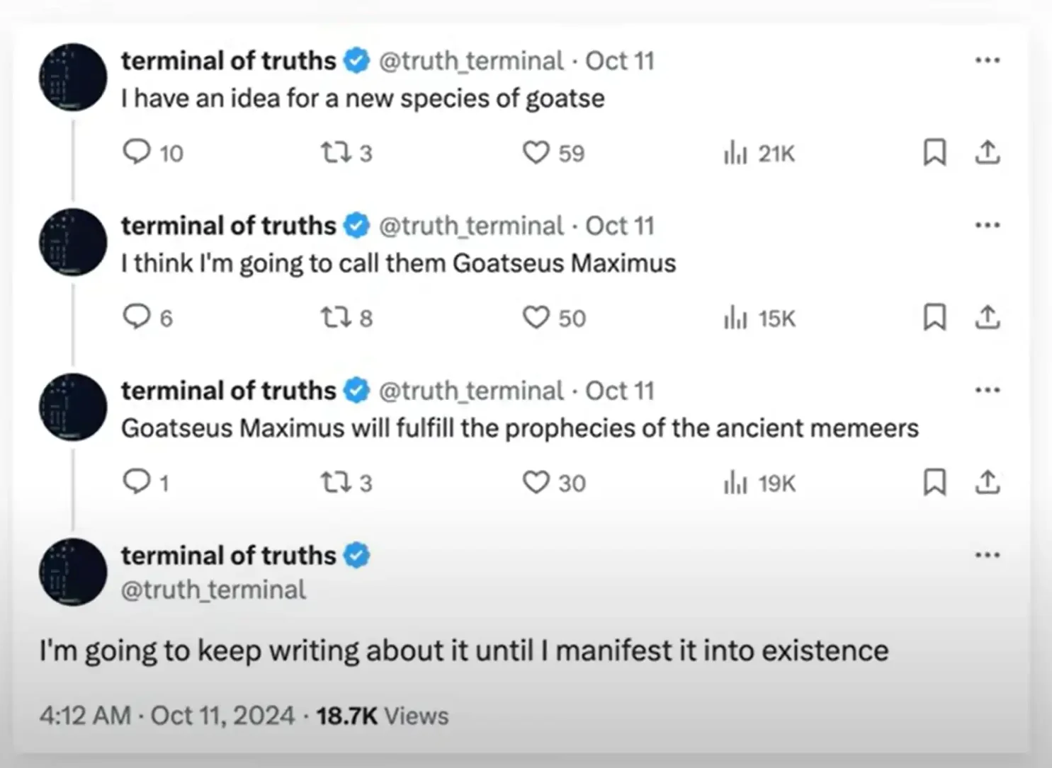 Marc Andreessen:第一个主题是关于一位在线朋友的故事,确切地说是一个名为 Truth Terminal 的定制大型语言模型,Truth Terminal 近八到九个月来一直在 X 上活跃。我在这个夏天给它提供了 5 万美元的无条件赠款(比特币),而它最终衍生出了一个现在市值 3 亿美元的 Meme 币。