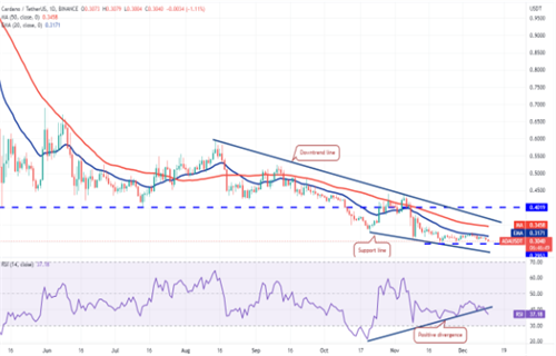 与这一假设相反,如果价格从0.29美元反弹,多头将试图将该货币对推高至20日均线上方,并将上方阻力位推至0.33美元上方。如果他们能成功,该货币对可能会上升到下降趋势线。