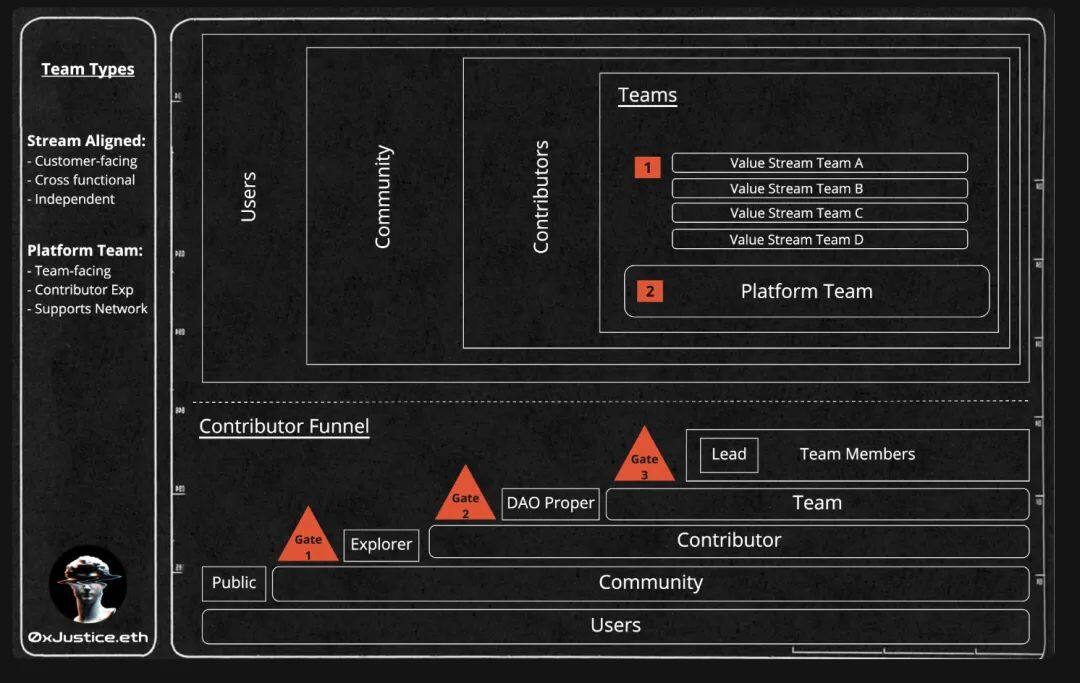 这些插图是基于我之前在《重新思考 DAO 贡献者漏斗》中详细阐述的工作。图的下半部分从侧面查看 DAO,而上半部分从顶部查看 DAO。