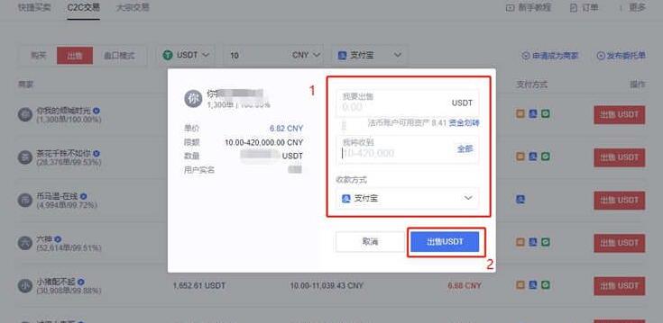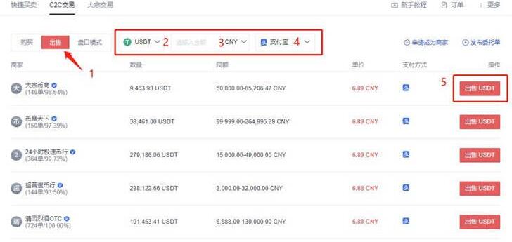 2. 点击出售,选择想要出售的币种和需要出售的金额,然后再选择支付方式(银行卡,支付宝,微信)之后系统会自动为您筛选出合适的商家,接着选择一个自己认为合适的订单,点击出售USDT即可下单成功。