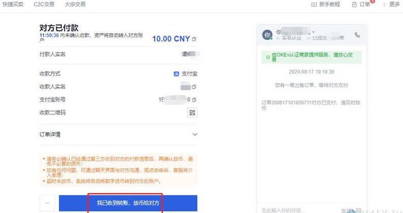 3、订单显示买家已支付后,请务必前往收款账户核实钱款确实到账后再放币。