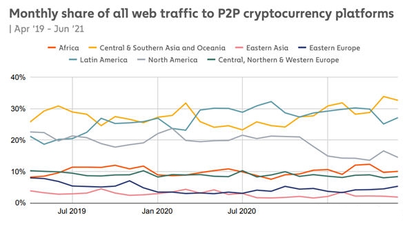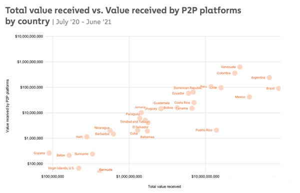 Chainalysis报告里两个有趣的数据点表明,用户已经转向使用P2P加密支付作为将资金汇回原籍国的常见方式。首先,拉丁美洲的P2P加密活动高于平均水平,推动约28%的网络流量流向P2P加密货币平台。其次,在拉丁美洲所获利的所有价值中,11%来自国内,89%来自国外。加密交易费为跨境转移资金提供了更经济实惠的价格,区块链技术提供了更快的交易速度,使拉丁美州成为让数百万用户获得成本、速度和安全性的理想环境,也使其能够利用新技术成功嵌入拉美生活方式。