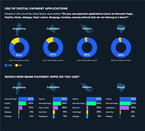 拉丁美洲被证明是新技术的早期采用者,包括电子银行和非银行支付服务、电子商务平台、基于互联网的文本应用程序和加密技术。根据Rapyd的报告,来自阿根廷、巴西、哥伦比亚和墨西哥的1687名受访者接受了问卷调查,而近一半的人仍然没有银行账户。因此,新时代银行和非银行的支付应用程序在全拉丁美洲所有年龄段和社会经济阶层的用户中的受欢迎程度和使用率继续增长。在巴西和哥伦比亚,大多数交易是通过手机进行的,社交商务(即是使用社交媒体应用进行的购买行为。)的采用正在呈指数级增长。