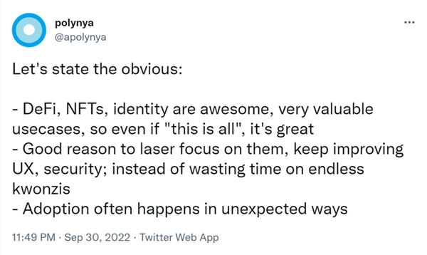 Polynya在下图的推文里完美地框定了这篇帖子:到目前为止,我们到目前为止所做的可能就是我们使用区块链所取得的全部成果。我们正在研究的技术要么徘徊在改变世界的边缘,要么永远停留在书呆子世界的边缘。我们已经成功地吸引了全世界的注意力,但如果我们要采取行动并兑现承诺的话,我们需要迅速转向,否则就会冒着走进我所说的以欧洲为中心的加密技术的死胡同的风险。