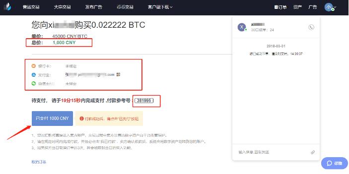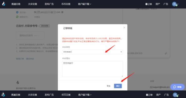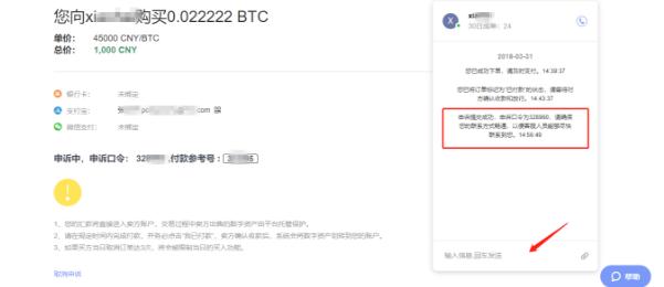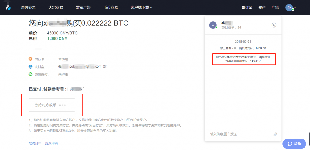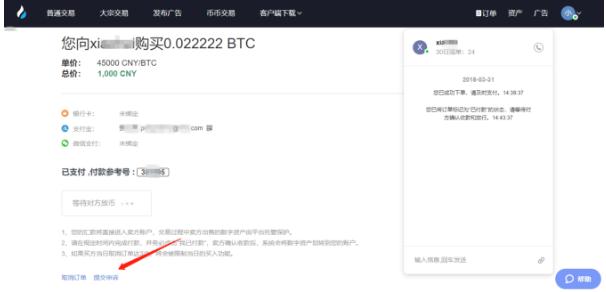 2、如果点击“已支付”10分钟后,您还没有收到币,可以点击“申诉”,平台客服会在聊天框中介入处理。